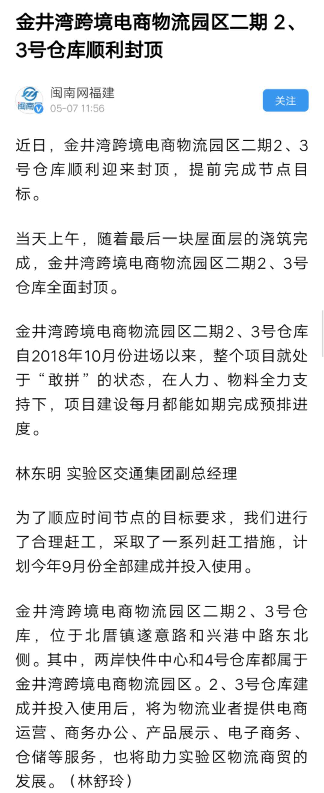 金井湾跨境电商物流园区二期2、3号仓库顺利封顶