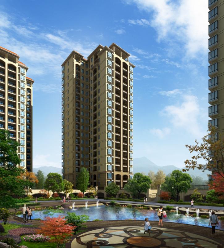小区建筑总体格局的形成是通过对基地所在周边环境分析后,留出视线通廊,并尽可能减小对周边环境的影响后最终确定的。基地地势是一个盆地,三面环山,基地内场地标高设计从西向东逐渐升高,南北向中间逐渐升高。因此沿着地势从西向东设置多层住宅,在基地的东侧,地势较高处设置高层住宅,形成从西向东层层递进的天际线。在基地的东侧,设置五栋高层建筑。